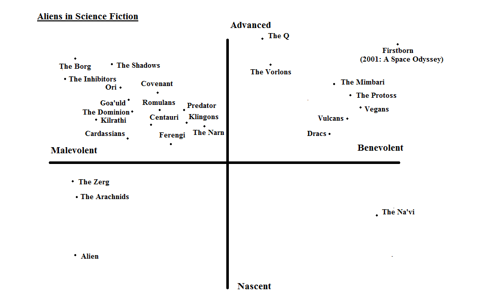 For example, notice how the vast majority of races from your well-known franchises (Star Trek, B5, Stargate, Star Craft, AvP, Halo, etc) fall into the upper left quadrant. This is the area where malevolence and technological sophistication combine in varying degrees. By contrast, the second largest concentration of races occurs in the advanced/benevolent quadrant, again to varying degrees. Almost no races fall into the nascent (i.e. primitive) quadrants, be they hostile or gentle.