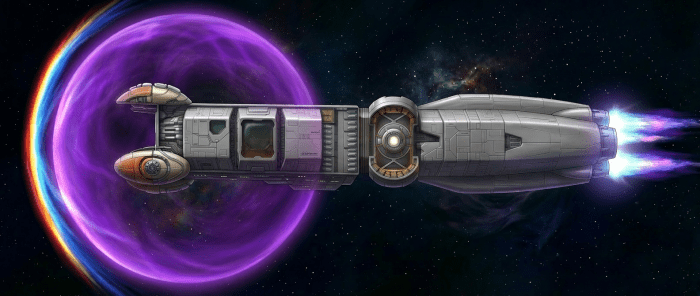 The Transverse is a generation ship bound for Delta Pavonis, a Sun-like star located about 20 light-years from the Sun. The ship is equipped with an anti-matter propulsion system, which allows the ship to achieve a maximum speed of 10% the speed of light. This means the total journey will take about 250 years, including acceleration and deceleration burns. It is protected from cosmic rays and small debris objects by a magnetic field projected from the front end.