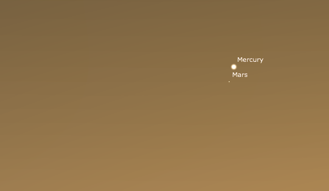 But be quick about it, since you’ll only have a 15-30 minute window (depending on latitude) to snare the pairing before they follow the setting Sun below the horizon. Photographing the pair will be tricky, though not impossible, since they present a very low contrast against the bright background twilight sky. And just in case you’re not impressed with the sight itself, consider that with Curiosity and other rovers operating on Mars and the Messenger satellite orbiting Mercury, permanent robotic “eyes” are monitoring both!