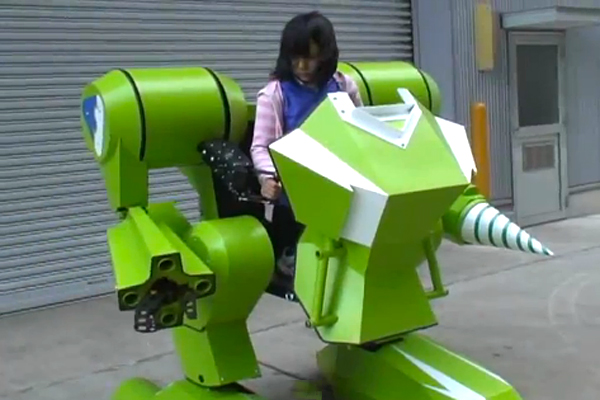 Move over coin-powered rocket ship! A Japanese company has just produced a robotics mecha suit for kids. It’s known as the Kid’s Walker Cyclops, a bright green robot that measures 2 meters (6’9″) tall, a meter (3’6″) wide, weighs in at a cool 750 pounds, and runs off rechargeable batteries. And most cool of all, it comes with two appendages: one a grappling claw and the other a drill, most likely for intimidating your enemies!