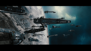 Then comes another moment in cinematic genius, the scene where the Imperial fleet is shown and the Executor (see More Cool Ships) is introduced. After seeing many massive Star Destroyers pass each other in the starry night, several of them are suddenly overtaken by a huge shadow. Naturally, the audience can’t help but wonder, what the hell is no big that it can cast a shadow capable of blacking out a whole fleet worth of Star Destroyers? A Super Star Destroyer, that’s what! We then cut to the bridge where Vader is watching the fleet, all to the tune of the evil Imperial music!