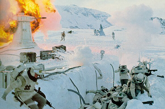 However, things don’t go so well. The AT-AT’s are too heavily armored to destroy with blasters, and the dug-in defenders weapons are similarly ineffective. Luke comes up with the bright idea to trip up the walkers using their tow cables, but this too begins to falter after the majority of Rogue Squadron gets shot down.