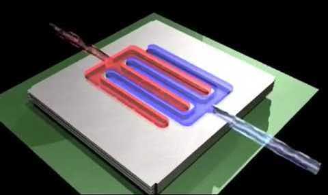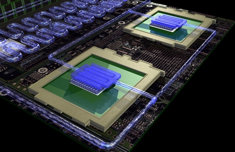 This process is demonstrated with the company’s prototype system called Aquasar. By branching chips into a network of liquid cooling channels that funnel fluid into ever-smaller tubes, the chips can be stacked together in large configurations without overheating. The liquid passes not next to the chip, but through it, drawing away heat in the thousandth of a second it takes to make the trip.