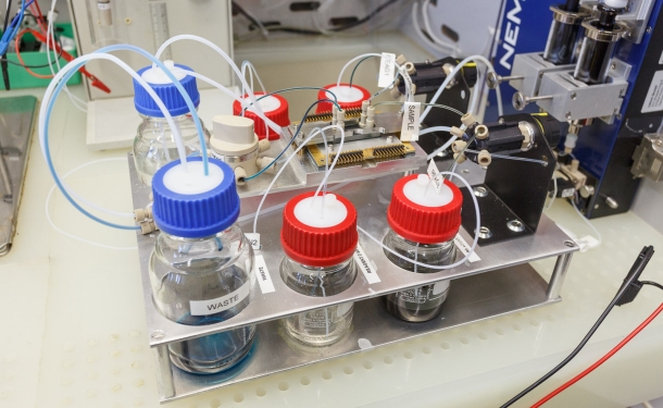 The electrolytes travel through ever-smaller tubes that are about 100 microns wide at their smallest – the width of a human hair – before handing off their power to conventional electrical wires. Flow batteries can produce between 0.5 and 3 volts, and that in turn means IBM can use the technology today to supply 1 watt of power for every square centimeter of a computer’s circuit board.