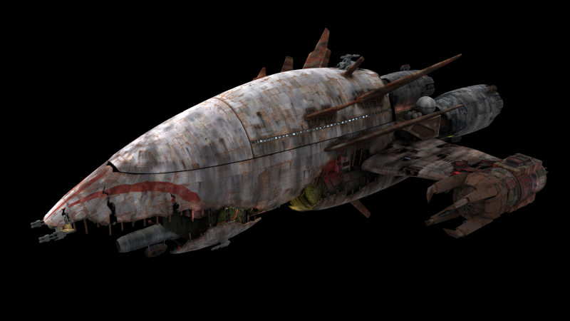 Like all Reaver ships, this vessel is adorned with red paint and what I can only assume is the blood of innocent victims. It’s hull and engine compartments have also been modified to look claw-like and threatening, it’s front section has been mangled from ramming into other ships, and its engine functions without radiation containment.