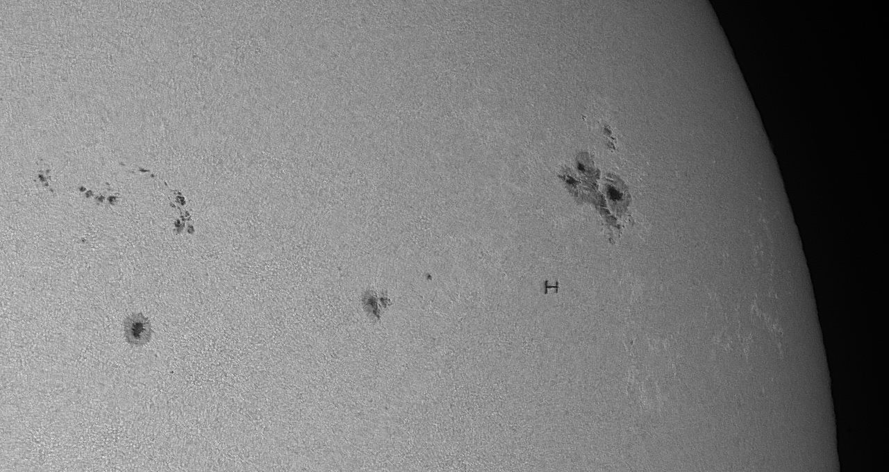 If you look closely at the picture above, you can just make out Tiangong-1 station to the right of the sun, located below and to the left of a large cluster of sun spots. This top image is a crop of a full-face view of the Sun, taken with white light filters by Thierry from southern France on June 16, just after noon UTC. The transit duration was just 0.46 seconds, the distance of the spacecraft to observer was 365 km away, and the spacecraft was traveling at 7.4km/s (26,500 km/h or 16,500 mph).