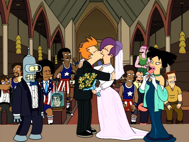 Futurama_FryandLeela'sweddingAnd in the meantime, I want to do a tribute piece for this awesome series and I’d like people’s help to make it happen. Since we collectively make up the fan community , I’d like to know from all of you what you thought was great about this show. What were the best episodes? What were the funniest moments? What were the saddest moments? Who were the greatest characters? And who do you think will pick it up for its third run?