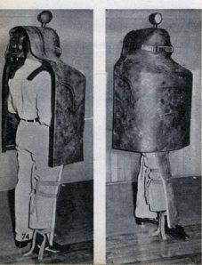 In the early 1900s, a man from Dover, New Jersey named Dr. Guy Otis Brewster was famous for his experiments with unusual body armors. Perhaps his most famous suit was the bulletproof suit shown at right, which bestowed the wearer with the mien of a warrior polygon. As was to be expected, his tests of this unusual costume garnered him some rather interesting press coverage.