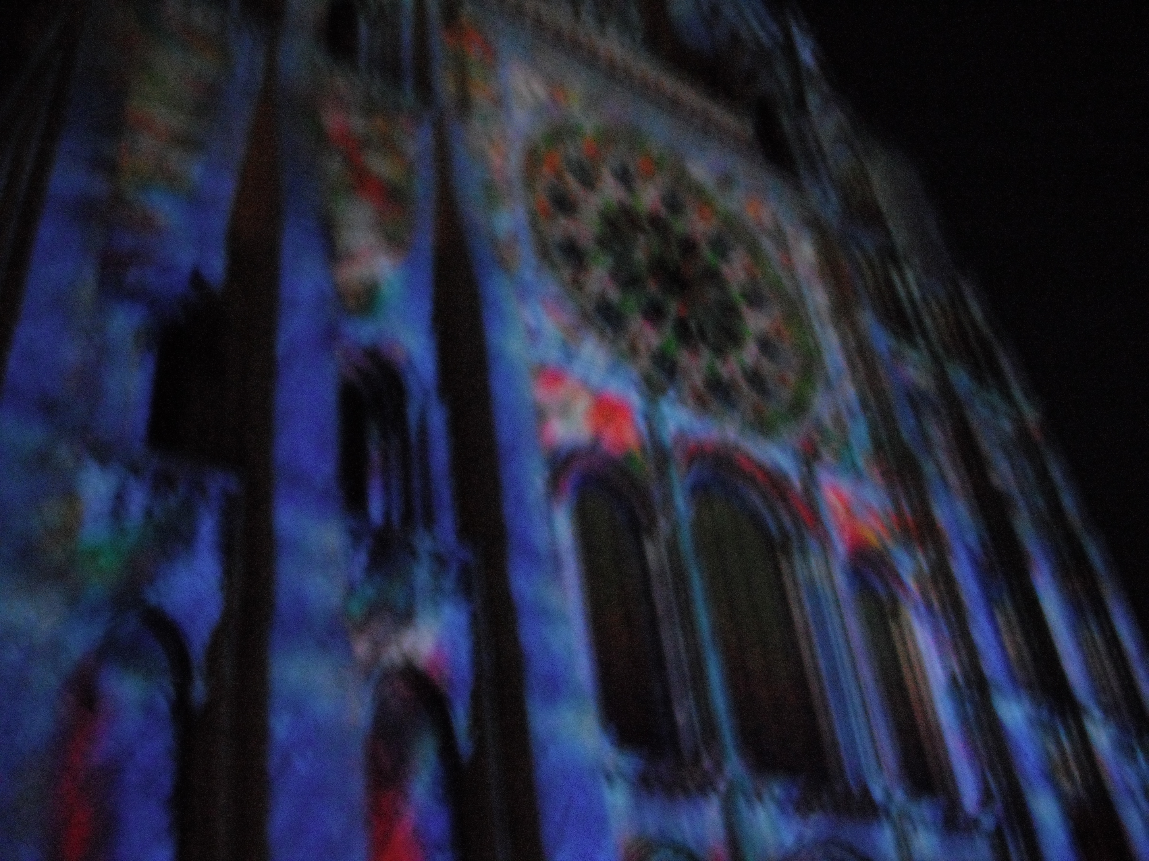 My wife and mother had the lasagna, which they didn’t really like, while my father enjoyed the filet de loup, and I enjoyed a filet of monkfish with chorizo. This was all washed down with glasses of Affligem, which were necessary after the Caldavos incident. And then, we popped back outside because we noticed an interesting light show happening on the front of the cathedral. At first, we thought someone was throwing rolls of TP down the front. But upon closer inspection, it turned out to be a dazzling visual display that was being projected onto the facade.