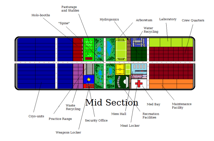 The rear and mid sections were already done, and posted here. However, some much needed back and forth with my crew made me rethink a few things about those. You can never revise something enough, especially something like a colony ship, where the needs of some thousand imaginary colonists are concerned 😉 In any case, I now present all three sections and the external view, completed, edited, and revised, together here for the first time. Behold!