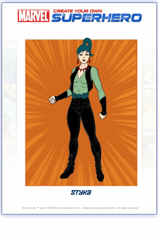 Backstory: While browsing a fine jewelry store, Kristy witnessed an armed robbery that went horribly wrong. During the commission of the robbery, the criminals caused an explosion that killed half their crew and the store. Taken as a hostage by the part of the crew that managed to escape, they took out their anger and frustration on Kristy and left for dead. When she woke up in hospital, she realized she could read minds, avoid detection, and even levitate and fly about. In her search for the the people who nearly killed her, Styka discovered that one of the city’s crime bosses had been responsible for the robbery. His orders were to kill the hostages but the robbers were as incompetent at that as they were at following the plan he had ordered. Her vendetta against her attackers became a vendetta against his as well.